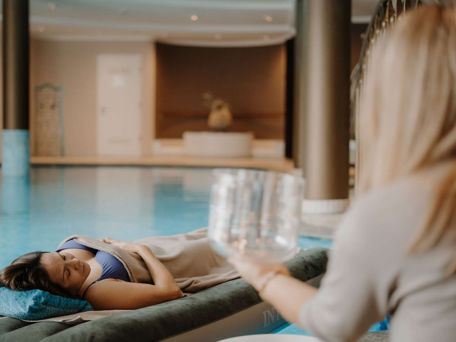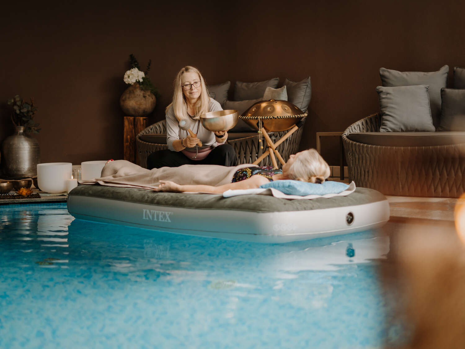 Beim Floating Sound Bath verbinden sich Wasser und Klang zu einem einzigartigen Entspannungserlebnis. Während du sanft im Wasser treibst, entfalten sich die Klänge rund um dich und schaffen eine besonders intensive Atmosphäre.